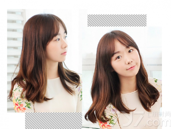 微卷烫发+棕色染发的这款长发空气刘海造型,轻松为女生打造出文静柔美的淑女形象,加上微中分设计的空气刘海搭配,瞬间又让女生多了几分可爱活泼的感觉。
