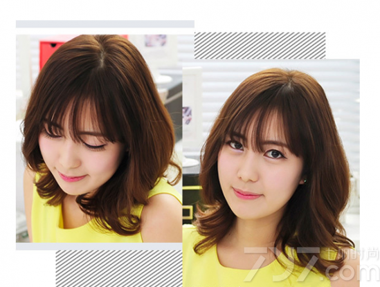 棕色染发搭配齐肩卷发的这款韩式发型,给人带来一种优雅妩媚的味道,而那空气感刘海的搭配让妹子看上去更年轻更具有气质一些。