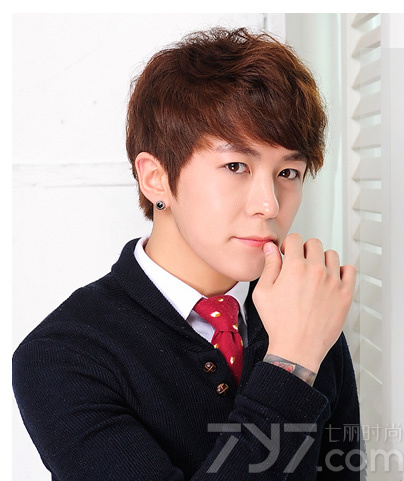 经过微微烫卷过的这款男生发型再搭配浅棕色染发,瞬间让这个造型都充满的时尚与绅士味道,同时还衬托出男生嫩白肌肤,加上西服与领带的装扮就是帅气十足。