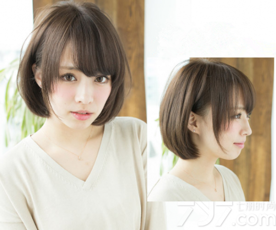 春季流行的这款中短发采用斜刘海搭配两边鬓角头发来帮助女生修饰出精致小V脸,再将中短发的发尾进行简约的内扣处理,轻松就使得造型清新而有甜美范儿。