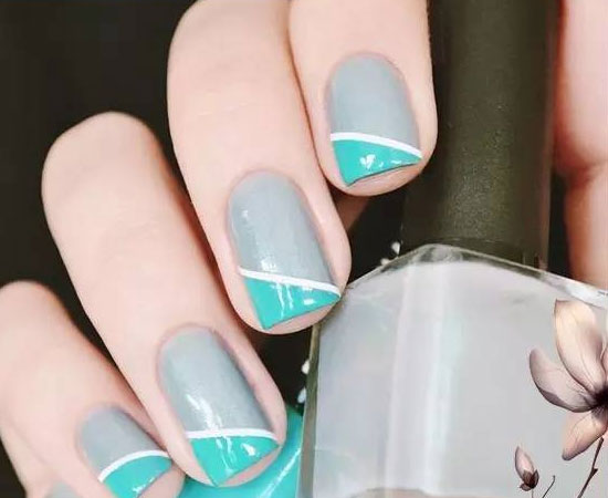 图案五:法式小清新美甲,指甲上的蓝绿色搭配底色浅灰色。不仅清新好看,也不失时尚。