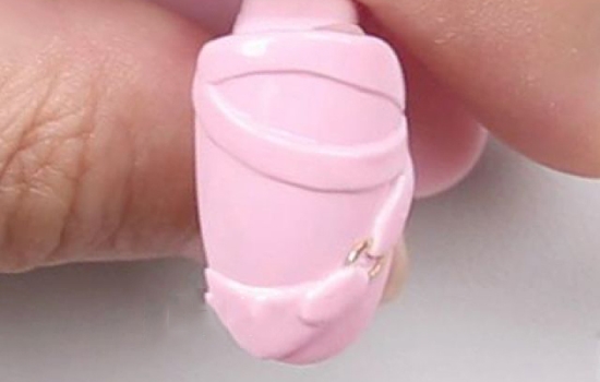 用小笔沾取裸粉色甲油胶,为雕花胶上色,照干后重复上色。