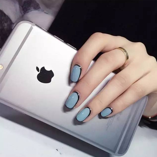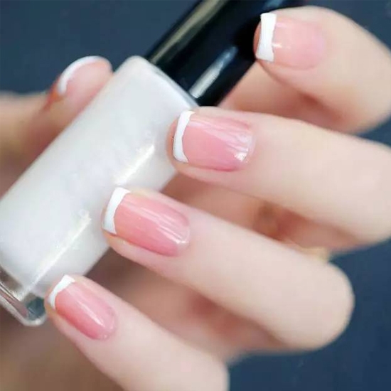 粉嫩的奶油粉底色,加上一条明朗的白色细勾边,很简单的法式美甲设计,很喜欢。