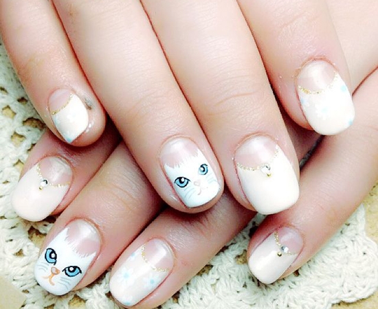 这款法式美甲将白色猫咪画在指甲上前端,或将蓝色小花画在白底指甲上,很适合可爱的女孩子哦。
