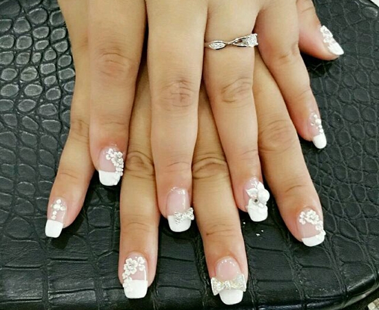 清纯白色花朵的点缀,或贴上一个与指甲同等宽度的白色蝴蝶结。这款法式美甲无论是从色彩还是样式都很适合新娘子在结婚那天画哦~