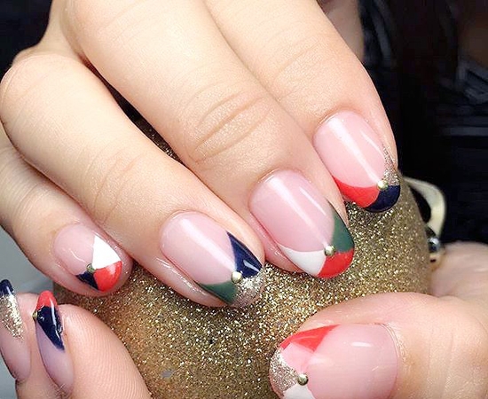 这款法式美甲色彩较多,不知道选择指甲颜色的可以选择这款哦~色块颜色选择不沉闷,撞色撞的很好看~色块的集中处用金色圆点做点缀,让三个色块不会太死板,多了一份活泼的味道。