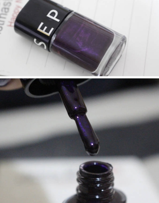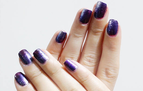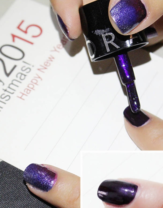 用深紫色的指甲油先给十个手指涂上单色,晾干。这样可以让整个美甲的颜色更加饱满,不会透光或者颜色不均匀。