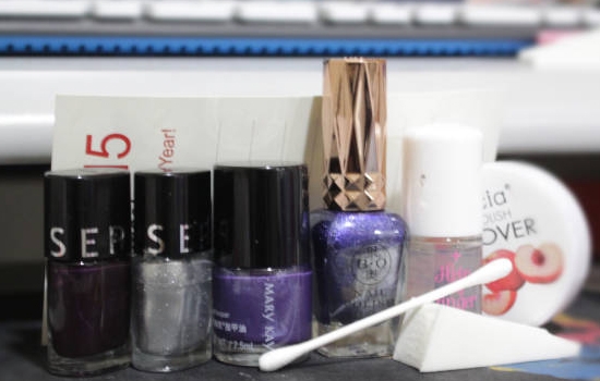 一瓶深紫色或黑色指甲油、4瓶带有珠光的彩色指甲油(柒小主选的是蓝色+粉色+紫色+银色)、一张硬卡纸、一块三角海绵扑、一瓶护甲亮油和几支干净的棉签。