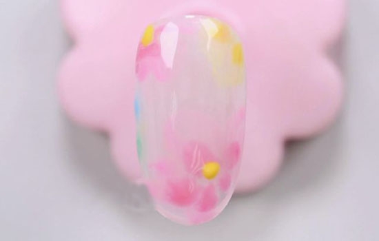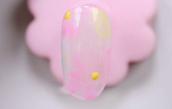 用小笔沾取西瓜红色甲油胶,点出颜色后用打圈的方式把颜色晕染开,作为较小但颜色较实的花瓣。然后沾取黄色与蓝色甲油胶用同样的方式画出剩余的花瓣,照灯。