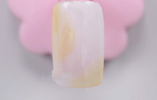 用小笔沾取黄色甲油胶,在甲面的左侧从上往下涂抹出色块并稍稍晕染开,再沾取更多的黄色甲油胶在靠近内部的位置涂抹出色块,在甲面的右侧沿着边缘刷出颜色后,斜向晕染开,照灯。