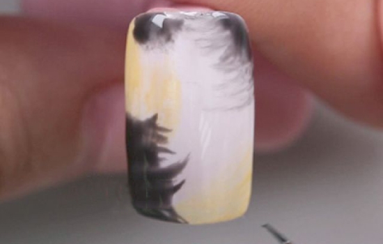 用小笔沾取黑色甲油胶,随意地在甲面边缘处涂抹出色块,把右侧的色块向甲面内部晕染开,为了做出明显的线条纹理,直接用小笔把颜色拉开即可!继续在左下方涂抹出较大的色块,向甲面内部拉出颜色较实的线条。