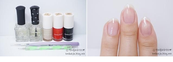 步骤一:将要使用到的甲油颜色是大红色、裸色和黑色,首先涂好透明底油待干。