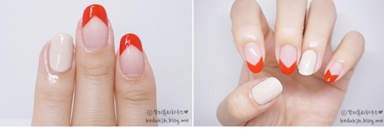 步骤二:挑选2个手指涂上裸色,另外三只手指在顶端画上三角法式,这个款式比普通法式更有活力感,和豹纹更搭。