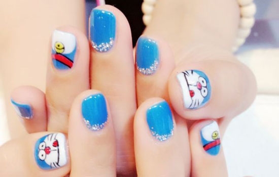 还记得给我们小时候带来无数欢乐的哆啦A梦吗,这次可以将可爱的蓝胖子画到指尖上来哟~基调为蓝色,在指甲末端用银色亮片简单的勾一个边。整个风格可爱又清新呢~