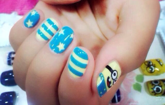《神偷奶爸》中的小黄人相信大家都喜欢吧,画上萌萌的小黄人变得可爱起来~黑黄色的搭配,条纹指甲与露出的淡黄色星星也很招人喜欢噢!