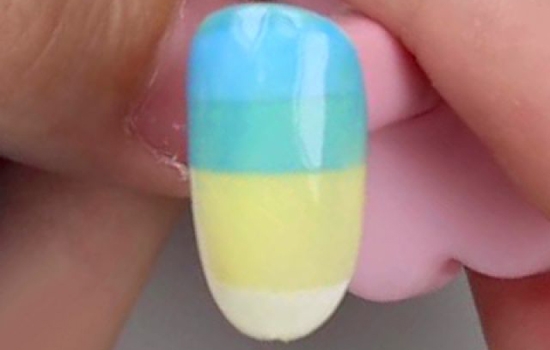 用蓝色甲油胶在甲面后端横向刷出色块,再纵向修饰,使颜色均匀,照干。