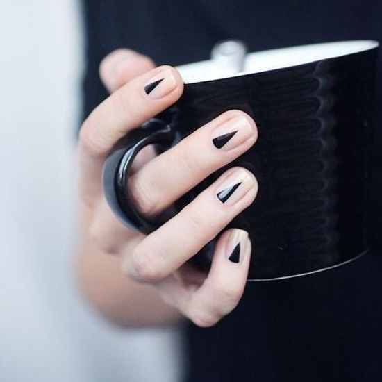 这款黑色美甲,直观就能看出来画法很简单,而且简单的黑色三角形看上去酷酷的,非常有个性!如果你是手残党可以借助一些工具,自己剪出你想要的三角形来画,同时还可以延伸出很多不同图案的美甲。