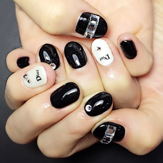 以品牌为主题的美甲图案,黑白色本来就是时尚经典色,跟这种时尚大牌结合在一起,也不为过,再配上水晶钻,十分上档次的一款美甲图案,很有名媛、贵气风。