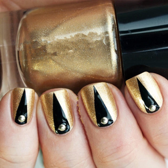 同样使用的是三角形的元素,除了时尚、个性外,由于金色的搭配,多了一种富贵气质,是一款百搭色的美甲。也不怎么挑手!