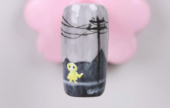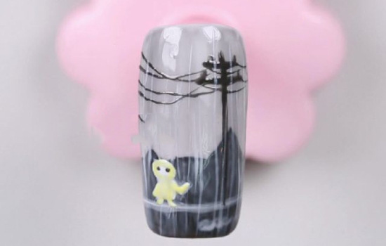 用小笔沾取白色甲油胶,画出雨滴,因为雨下得很大,所以雨滴都连成线了。雨滴滴在小人身上形成了一层白雾,所以稍稍描绘小人的身体,照灯。最后刷上封层完成啦~