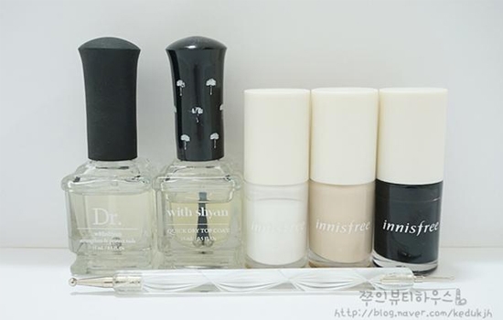 这次主要用到的美甲工具如下面图片中的工具,指甲油颜色是黑、白、裸三色。