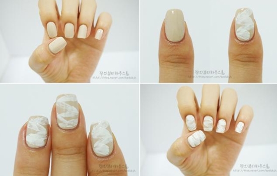 STEP2:等裸色干透后,用白色甲油在甲面画上“W”形线条,整齐度不用太在意。随意一点,更能有种自然的肌理效果。值得注意的是,一定要等之前的颜色干了之后,才能进行下一步,这也是很多妹子画出来的指甲不漂亮的原因之一。