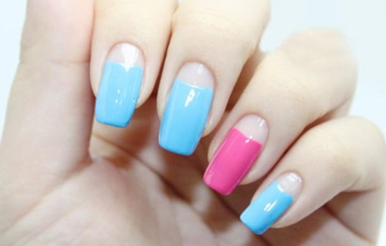 STEP1:修剪,擦洗,打磨完指甲之后,给指甲上一层底油,然后用蓝色和粉色甲油分别给指尖涂上颜色。要注意甲油不要涂到甲床根部哦,画成微笑线状就可以了。