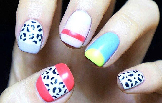 想不到以清纯主打的白色也可以热辣豹纹吧?经典黑白搭配,配以多色的甲油冲淡豹纹带来的成熟感,这款美甲比较适合刚上班的毕业生们。