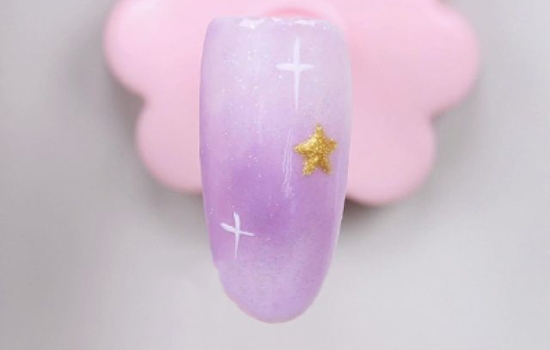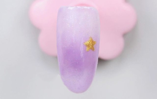用小笔沾取金色闪粉甲油,点出星星四个角的位置,然后把它们连起来,照灯。