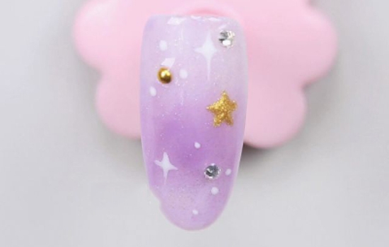 用光疗胶粘上钻饰,照灯。刷完封层,这样一款漂亮的紫色美甲就完成啦!