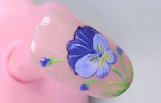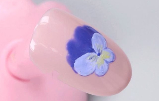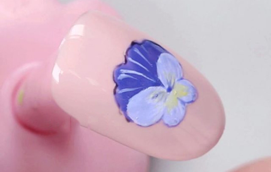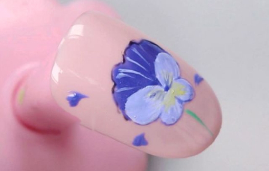 用小笔沾取紫蓝色甲油胶描绘蝴蝶兰的边缘并画出花蕊,照干。