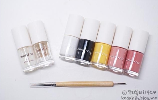 需要用到底油、亮油,白、黑、黄三款点缀色和作为主色的深浅2款豆沙红色,以及画笔一支。