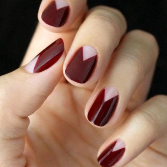 这款美甲比较适合日常,画法很简单,如果不好掌控三角的面积,可以采取借助其他工具来画,比如便利贴、胶带之类的,剪成如图的三角形,贴在中间位置,或者你想要三角待着的位置。然后直接在上底油后涂上红色甲油即可了。