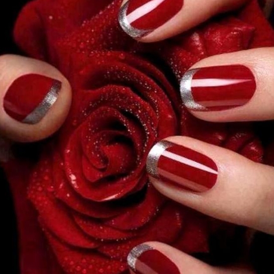 这款美甲的红色很正,也适合新娘。是法式美甲的涂法,只是上面的部分不是哑光的甲油,换成了亮片的白金色甲油,点缀整个红色甲面,整个红色指甲看着不沉闷。