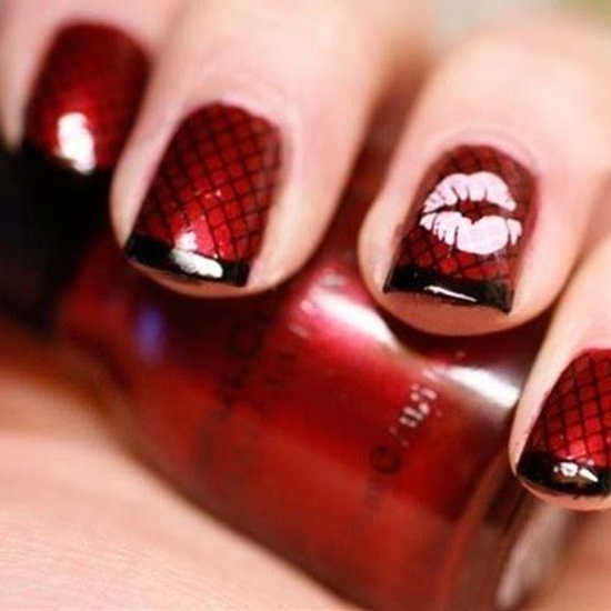 这款红色指甲相对其他的显得时尚。适合派对、夜店比较热闹的场合。还是法式美甲的涂法,对于上面的网状其实很好化的,可以借助其他工具来完成,不要的网状纱布之类的,可以铺在上面,打底色采取黑色,上面涂红色,这样网状下面的黑色格子就自然形成了。
