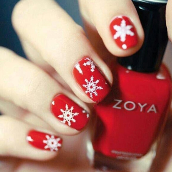 这款美甲一看就是适合圣诞节的美甲了,不过平时也可以做这款美甲,因为它虽是主体性强的美甲,但整个的颜色搭配和图案搭配,都比较时尚,没有特别的局限性。它的画法也很简单,红色的底色,加上雪花图案。用小笔仔细描绘即可。