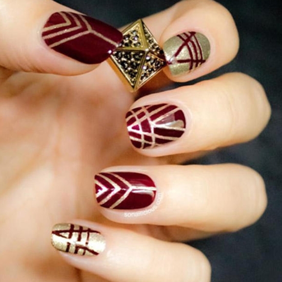 这款美甲比起上面的那款指向性会强一些,它是酒红色和金色一起搭配的,还有线条元素,整个就是很时尚、个性的风格,有种T台风的感觉。适合一些时尚人士和时尚穿搭。