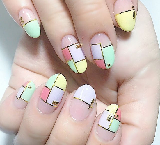 粉色、薄荷绿、淡紫、嫩黄,这四种颜色都是清新颜色的代表,组合在一起的清新气息扑面而来,用金边勾勒出来的拼接图案,令这款美甲更有个性。