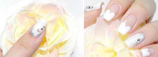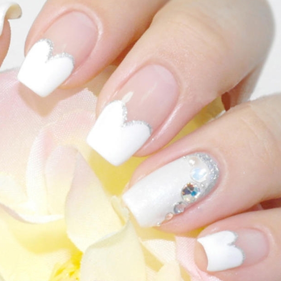 这款白色的新娘美甲,使用了心形元素和钻,心形是爱情的象征,钻则是衬托新娘的美丽。很适合白色婚纱的新娘。