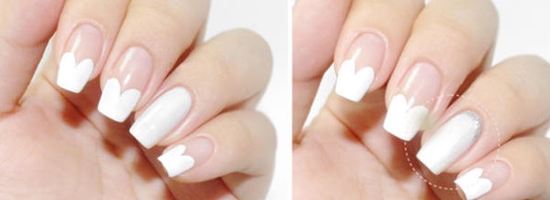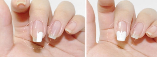 STEP3:给食指和小拇指也画上爱心后,大拇指和无名指都用白色甲油涂满。