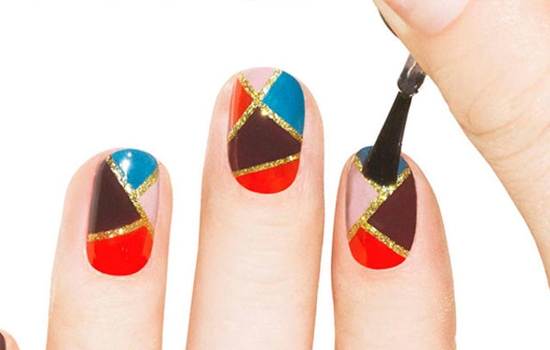 STEP5:用金色亮粉甲油刷涂抹在不同颜色交汇的地方,呈细细的一条金边。重复涂抹,直到你满意金边的浓度为止,留出时间让两层甲油之间的区域变干。
