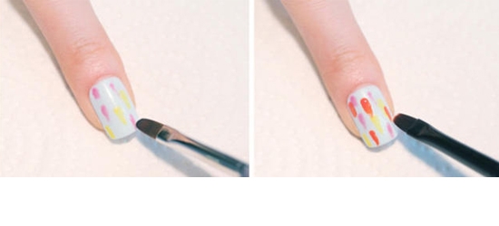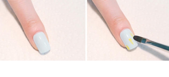 STEP2:待甲油完全干燥后,沾取黄色指甲油,在空白处竖着画几条短线。