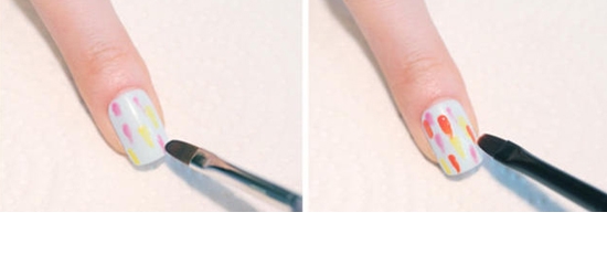 STEP4:沾取橙色指甲油,在空白处竖着画几条短线。