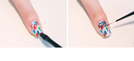 STEP6:用细刷子沾取黑色指甲油,横向画上间断的黑线。