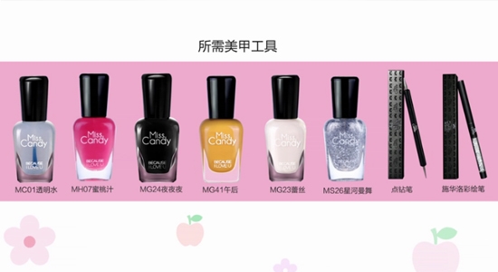 hellokitty美甲团工具:MC01透明水、MH07蜜桃汁、MG24夜夜夜、MG41午后、,G23蕾丝、MS26银河曼舞、点钻笔、施华洛彩绘笔。