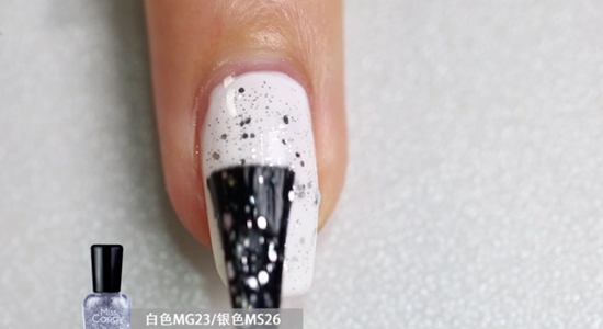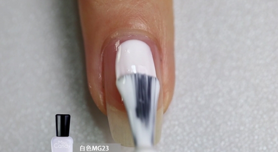 STEP6:在无名指上均匀涂上白色指甲油,干后,涂上薄薄的闪银指甲油。