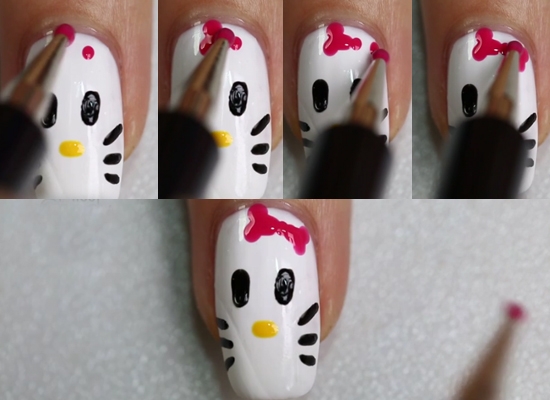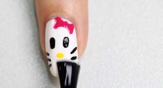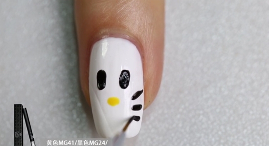 STEP3:接着用点钻笔画出眼睛和鼻子,用画笔在指甲两侧画出胡须,最后用点钻笔画出蝴蝶结。