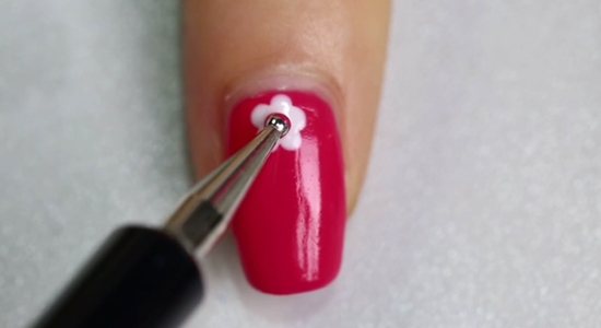 STEP5:接着用点钻笔点上5个白色大圆点,圆点中间点上桃红色大圆点。