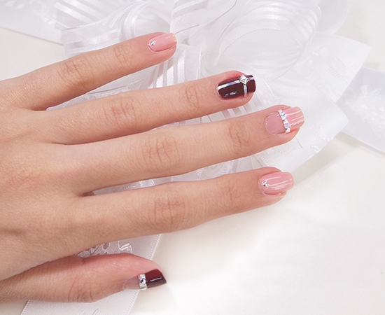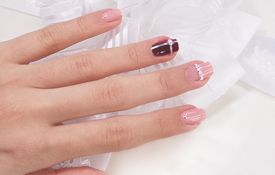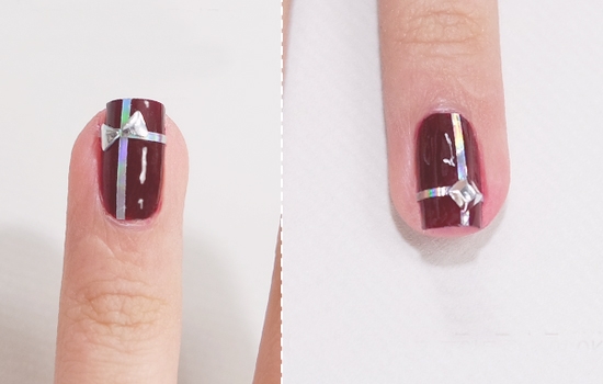 STEP8:在酒红色甲油细长条交界处贴上蝴蝶结水钻或者菱形水钻。