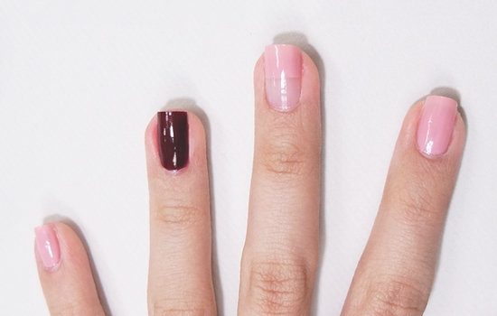 STEP1:在指甲上分别涂上大裸色粉和酒红色,中指只要涂上半段就可以哦。